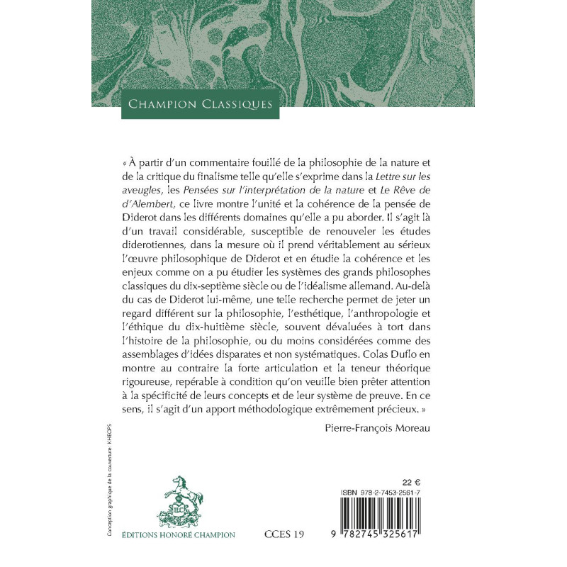 This study highlights the coherence, cohesiveness and theoretical rigor of Diderot’s thought, and more generally of \18th-century philosophy, anthropology and ethics, which are too often dismissed as loose aggregates of disparate ideas when compared with their classical, 17th-century counterparts.\