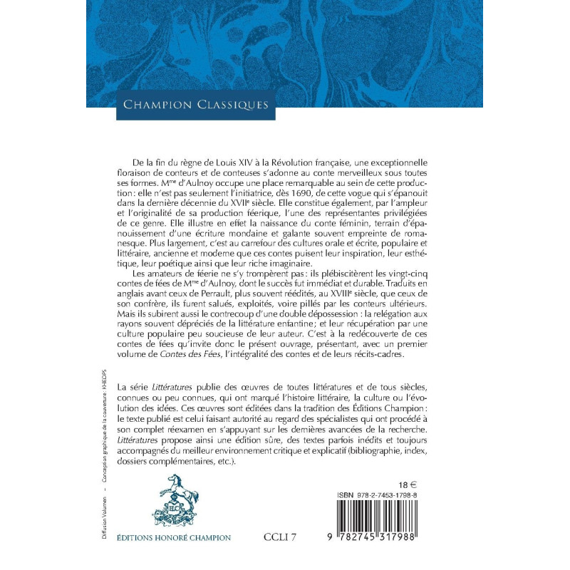 De la fin du règne de Louis XIV à la Révolution française, une exceptionnelle floraison de conteurs et de conteuses s'adonne au conte merveilleux sous toutes ses formes. Mme d'Aulnoy occupe une place remarquable au sein de cette production : elle n'est pas seulement l'initiatrice, dès 1690, de cette vogue qui s'épanouit dans la dernière décennie du XVIIe siècle. Elle constitue également, par l'ampleur et l'originalité de sa production féerique, l'une des représentantes privilégiées de ce genre. Elle illustre en effet la naissance du conte féminin, terrain d'épanouissement d'une écriture mondaine et galante souvent empreinte de romanesque. Plus largement, c'est au carrefour des cultures orale et écrite, populaire et littéraire, ancienne et moderne que ces contes puisent leur inspiration, leur esthétique, leur poétique ainsi que leur riche imaginaire.