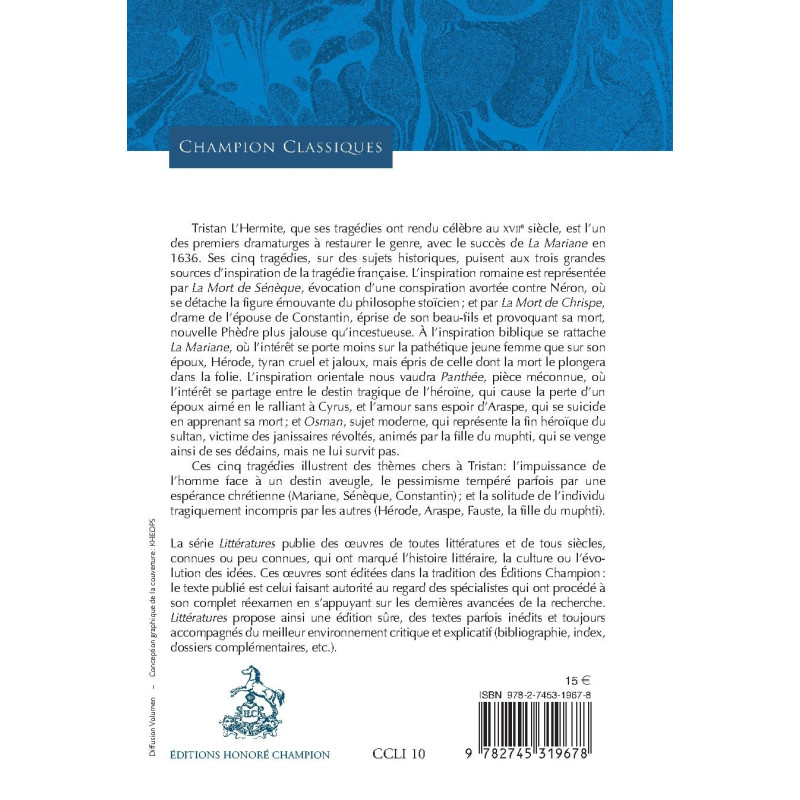Tristan L'Hermite, que ses tragédies ont rendu célèbre au XVIIe siècle, est l'un des premiers dramaturges à restaurer le genre, avec le succès de La Mariane en 1636. Ses cinq tragédies, sur des sujets historiques, puisent aux trois grandes sources d'inspiration de la tragédie française. L'inspiration romaine est représentée par La Mort de Sénèque, évocation d'une conspiration avortée contre Néron, où se détache la figure émouvante du philosophe stoïcien ; et par La Mort de Chrispe, drame de l'épouse de Constantin, éprise de son beau-fils et provoquant sa mort, nouvelle Phèdre plus jalouse qu'incestueuse. À l'inspiration biblique se rattache La Mariane, où l'intérêt se porte moins sur la pathétique jeune femme que sur son époux, Hérode, tyran cruel et jaloux, mais épris de celle dont la mort le plongera dans la folie. L'inspiration orientale nous vaudra Panthée, pièce méconnue, où l'intérêt se partage entre le destin tragique de l'héroïne, qui cause la perte d'un époux aimé en le ralliant à Cyrus, et l'amour sans espoir d'Araspe, qui se suicide en apprenant sa mort ; et Osman, sujet moderne, qui représente la fin héroïque du sultan, victime des janissaires révoltés, animés par la fille du muphti, qui se venge ainsi de ses dédains, mais ne lui survit pas. Ces cinq tragédies illustrent des thèmes chers à Tristan: l'impuissance de l'homme face à un destin aveugle, le pessimisme tempéré parfois par une espérance chrétienne (Mariane, Sénèque, Constantin) ; et la solitude de l'individu tragiquement incompris par les autres (Hérode, Araspe, Fauste, la fille du muphti).