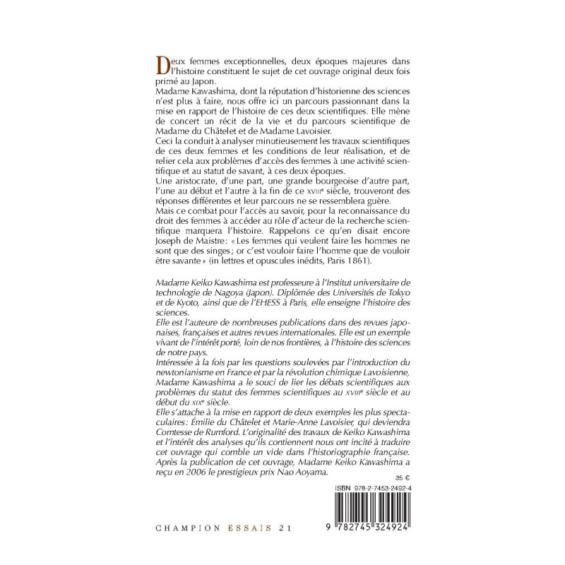 Deux femmes exceptionnelles, deux époques majeures dans l’histoire constituent le sujet de cet ouvrage original deux fois primé au Japon. Madame Kawashima, dont la réputation d’historienne des sciences n’est plus à faire, nous offre ici un parcours passionnant dans la mise en rapport de l’histoire de ces deux scientifiques. Elle mène de concert un récit de la vie et du parcours scientifique de Madame du Châtelet et de Madame Lavoisier. Ceci la conduit à analyser minutieusement les travaux scientifiques de ces deux femmes et les conditions de leur réalisation, et de relier cela aux problèmes d’accès des femmes à une activité scientifique et au statut de savant, à ces deux époques. Une aristocrate, d’une part, une grande bourgeoise d’autre part, l’une au début et l’autre à la fin de ce XVIIIe siècle, trouveront des réponses différentes et leur parcours ne se ressemblera guère. Mais ce combat pour l’accès au savoir, pour la reconnaissance du droit des femmes à accéder au rôle d’acteur de la recherche scientifique marquera l’histoire. Rappelons ce qu’en disait encore Joseph de Maistre : "Les femmes qui veulent faire les hommes ne sont que des singes; or c’est vouloir faire l’homme que de vouloir être savante" (in lettres et opuscules inédits, Paris 1861).