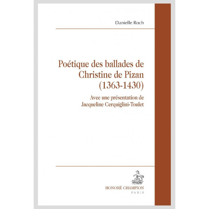 Cet essai présente un éclairage original de l’œuvre poétique de Christine de Pizan. L’analyse est centrée sur le manuscrit Harley 4431 et envisage tous les aspects techniques des ballades, des questions rythmiques et métriques à la confrontation avec la prose. Animée par une évidente empathie pour Christine, l’auteur fait ressentir le souffle intérieur de l’œuvre et en propose des clefs inattendues. Sans omettre au passage de déconstruire certaines critiques de la poétesse avec une rigueur aussi implacable que savoureuse.