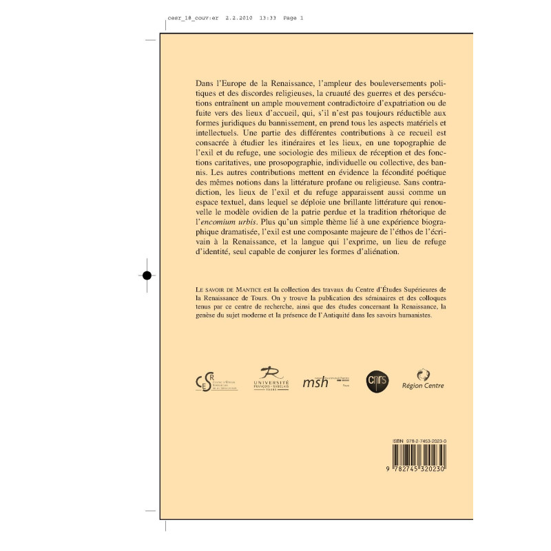 Dans l`Europe de la Renaissance, l`ampleur des bouleversements politiques et des discordes religieuses, la cruauté des guerres et des persécutions entraînent un ample mouvement contradictoire d`expatriation ou de fuite vers des lieux d`accueil, qui, s`il n`est pas toujours réductible aux formes juridiques du bannissement, en prend tous les aspects matériels et intellectuels. Une partie des différentes contributions à ce recueil est consacrée à étudier les itinéraires et les lieux, en une topographie de l`exil et du refuge, une sociologie des milieux de réception et des fonctions caritatives, une prosopographie, individuelle ou collective, des bannis. Les autres contributions mettent en évidence la fécondité poétique des mêmes notions dans la littérature profane ou religieuse. Sans contradiction, les lieux de l`exil et du refuge apparaissent aussi comme un espace textuel, dans lequel se déploie une brillante littérature qui renouvelle le modèle ovidien de la patrie perdue et la tradition rhétorique de l`encomium urbis. Plus qu`un simple thème lié à une expérience biographique dramatisée, l`exil est une composante majeure de l`éthos de l`écrivain à la Renaissance, et la langue qui l`exprime, un lieu de refuge d`identité, seul capable de conjurer les formes d`aliénation.