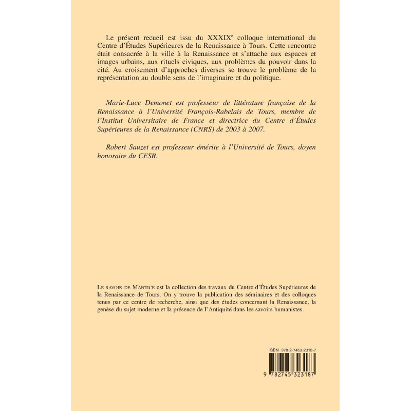 RITUELS ET ESPACES CIVIQUES. La ville en fête: conceptions et représentations à Francfort (et dans quelques autres villes de l`empire) à la fin du XVe siècle. La scène du Kremlin: lieux de mémoire (1550-1650). Approaching the City: Dynamism and Stasis in Ritual Studies. La persistance des patrons: la représentation de Zurich avant et après la Réforme. Presence and Representation in Italian Civic Rituals. L`espace public et privé à Gênes à la fin de la Renaissance: l`humanisme civique d`Andrea Spinola. Une nouvelle pensée républicaine: critique de la tradition communale et réforme du gouvernement dans les écrits politiques de Francesco Guicciardini. IMAGINAIRES ET POUVOIRS URBAINS. Les villes vues du ciel. Les murs de la ville, frontières en pierre de l`imagi naire? Sorcellerie et magie d ans l`espace urbain. La ville, le prince et la bibliothèque. Espace, savoirs et pouvoirs dans l`Europe de la Renaissance (1437-1523). Ville, culture et pouvoir dans l`imaginaire des historiens français du XVIe siècle. Mythes et représentations: l`identité de Chartres aux XVIe et XVIIe siècles. L`image de Nîmes antique dans Le Discours historial de Jean Poldo d`Albenas (1559). ESPACES SOCIAUX ET PRATIQUES MÉMORIALES. Civic Ceremony in Renaissance London. Le Journal de Henry Machyn, bourgeois et marchand tailleur londonien: Londres entre catholicisme et anglicanisme. Rituel, événement et propagande: les processions strasbourgeoises durant les guerres bourguignonnes (1474-1477). ESPACES SOCIAUX ET CONFLITS URBAINS. Les paradoxes d` un e ville-frontière. Conflits et compromis à Marseille au XVIe siècle. Construction généalogique et ascension sociale: pour unusage critique du cabinet des titres de la Bibliothèque nationale. Le cas des Larcher d`Olizy (Paris-XVIe siècle). ESPACES URBAINS ET REPRÉSENTATIONS. Theater, Trade and a City`s Identity: the Rhetorical Plays in Sixteenth-Century Antwerp. Tours et Paris a u début de la Renaissance: deux images contrastées.