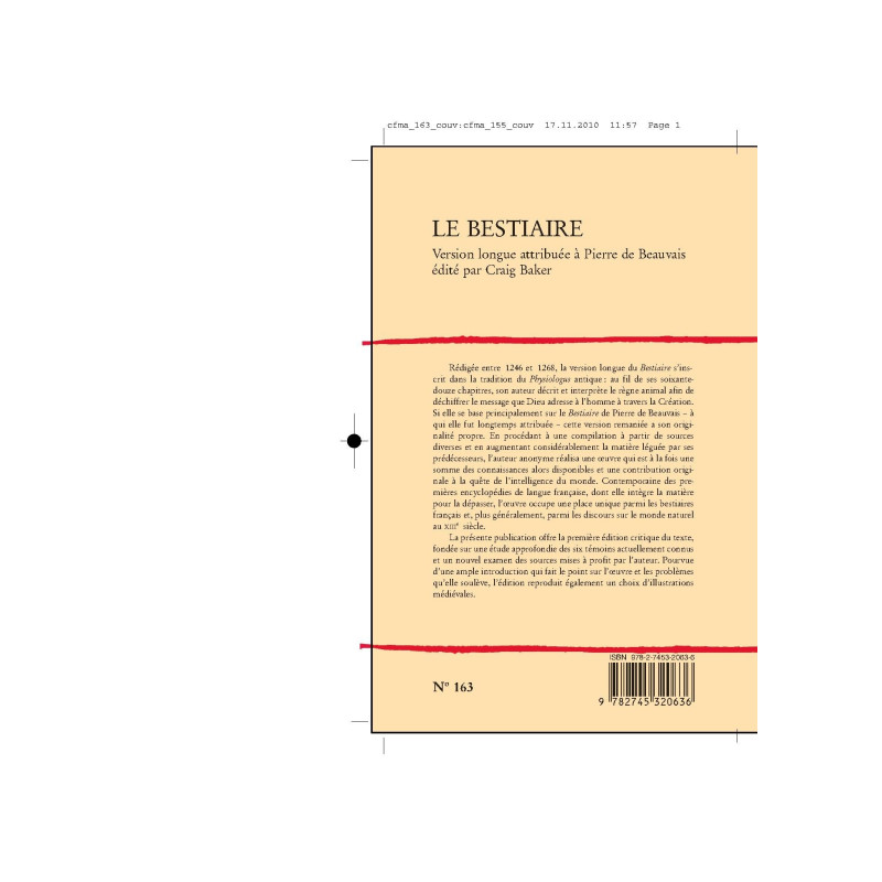 Rédigée entre 1246 et 1268, la version longue du Bestiaire s`inscrit dans la tradition du Physiologus antique : au fil de ses soixante-douze chapitres, son auteur décrit et interprète le règne animal afin de déchiffrer le message que Dieu adresse à l`homme à travers la Création. Si elle se base principalement sur le Bestiaire de Pierre de Beauvais - à qui elle fut longtemps attribuée - cette version remaniée a son originalité propre. En procédant à une compilation à partir de sources diverses et en augmentant considérablement la matière léguée par ses prédécesseurs, l`auteur anonyme réalisa une œuvre qui est à la fois une somme des connaissances alors disponibles et une contribution originale à la quête de l`intelligence du monde. Contemporaine des premières encyclopédies de langue française, dont elle intègre la matière pour la dépasser, l`œuvre occupe une place unique parmi les bestiaires français et, plus généralement, parmi les discours sur le monde naturel au XIIIe siècle. La présente publication offre la première édition critique du texte, fondée sur une étude approfondie des six témoins actuellement connus et un nouvel examen des sources mises à profit par l`auteur. Pourvue d`une ample introduction qui fait le point sur l`œuvre et les problèmes qu`elle soulève, l`édition reproduit également un choix d`illustrations médiévales.
