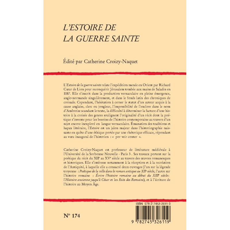 This singular Anglo-Norman text recounts Richard Lionheart’s 1187 expedition to re-conquer Jerusalem from Saladin. It is a major landmark in the emergence of historiography and the search for historiographical ethics and an efficient rhetoric that could fulfill the historian’s inaugural wish: “por veir conter”.