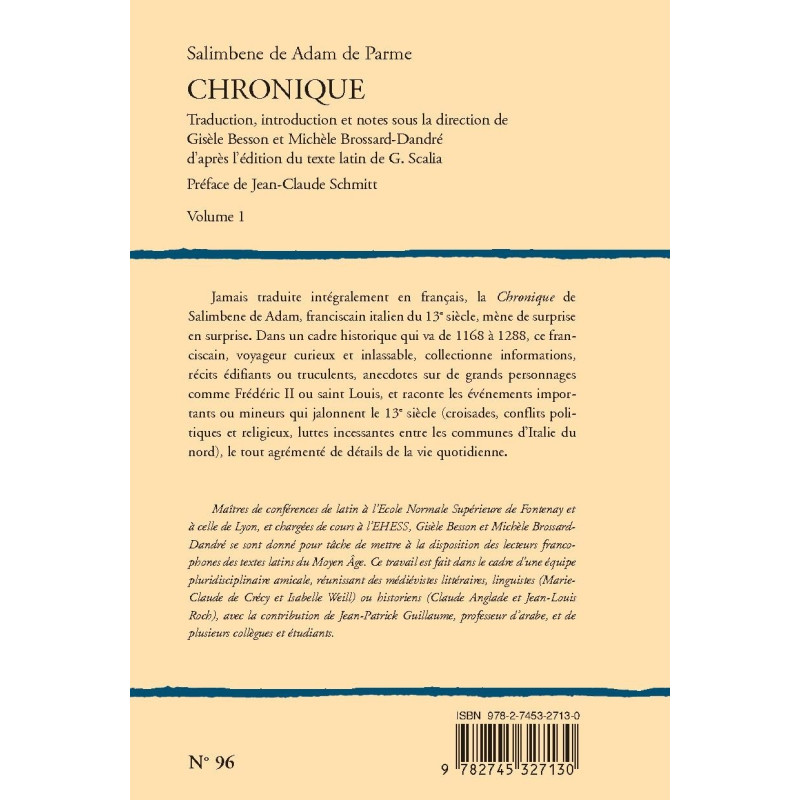 Never fully translated into French, the Chronicles by Salimbene de Adam, an Italian Franciscan monk and tireless traveller from the 13th century, replete with edifying or colorful narratives, anecdotes about major historical figures and details from everyday life, chronicle the century’s events, big and small.
