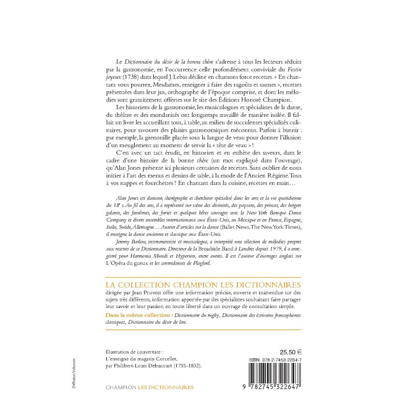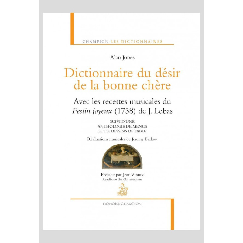 The Dictionnaire du désir de la bonne chère appeals to readers interested in gastronomy. The author presents several hundred recipes which are of great interest to culinary historians, musicians, dance specialists and choreographers. The present work includes the musical recipes of the Festin joyeux (1738) by J. Lebas, followed by an anthology of menus.