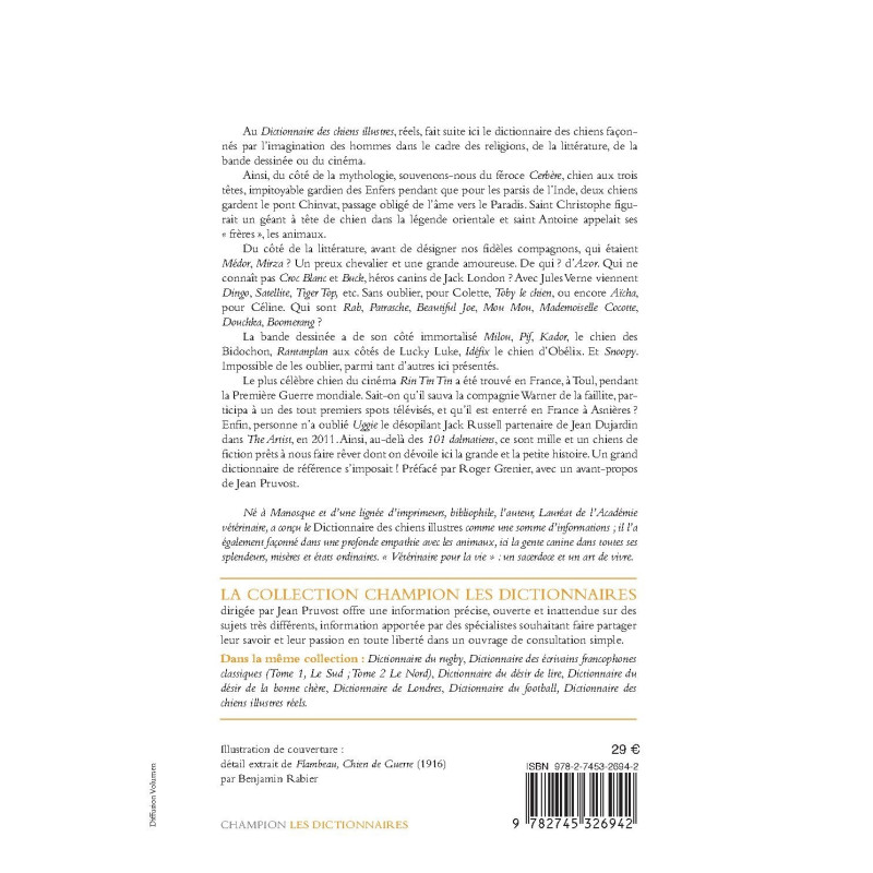 Du côté de la littérature, avant de désigner nos fidèles compagnons, qui étaient « Médor, Mirza »? Un preux chevalier et une grande amoureuse. De qui ? d’ « Azor ». Qui ne connaît pas « Croc Blanc » et « Buck », héros canins de Jack London ? Avec Jules Verne viennent « Dingo », « Satellite », « Tiger Top », etc. Sans oublier, pour Colette, « Toby le chien », ou encore « Aïcha », pour Céline. Qui sont « Rab, Patrasche, Beautiful Joe, Mou Mou, Mademoiselle Cocotte, Douchka, Boomerang » ? La bande dessinée a de son côté immortalisé « Milou », « Pif », « Kador », le chien des Bidochon, « Rantanplan » aux côtés de Lucky Luke, « Idéfix » le chien d’Obélix. Et « Snoopy ». Impossible de les oublier, parmi tant d’autres ici présentés. Le plus célèbre chien du cinéma « Rin Tin Tin » a été trouvé en France, à Toul, pendant la Première Guerre mondiale. Sait-on qu’il sauva la compagnie Warner de la faillite, participa à un des tout premiers spots télévisés, et qu’il est enterré en France à Asnières ? Enfin, personne n’a oublié « Uggie » le désopilant Jack Russell partenaire de Jean Dujardin dans « The Artist », en 2011. Ainsi, au-delà des « 101 dalmatiens », ce sont mille et un chiens de fiction prêts à nous faire rêver dont on dévoile ici la grande et la petite histoire. Un grand dictionnaire de référence s’imposait ! Préfacé par Roger Grenier, avec un avant-propos de Jean Pruvoost.
