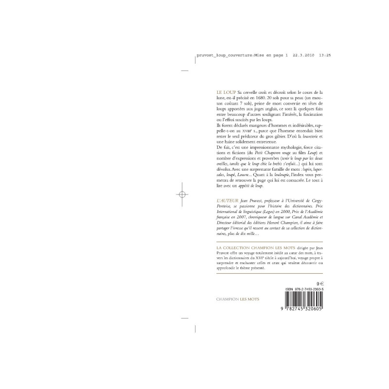 Sa cervelle croît et décroît selon le cours de la lune, est-il précisé en 1680. 20 sols pour sa peau (un mouton coûtant 7 sols), peine de mort convertie en têtes de loups apportées aux juges anglais, ce sont là quelques faits entre beaucoup d`autres soulignant l`intérêt, la fascination ou l`effroi suscités par les loups. Ils furent déclarés mangeurs d`hommes et indésirables, rappelle-t-on au XVIIIe s., parce que l`homme entendait bien rester le seul prédateur du gros gibier. D`où la louveterie et une haine solidement entretenue. De fait, c`est une impressionnante mythologie, force citations et fictions (du Petit Chaperon rouge au film Loup) et nombre d`expressions et proverbes (tenir le loup par les deux oreilles, tandis que le loup chie la brebis s`enfuit...) qui lui sont dévolus. Avec une surprenante famille de mots : lupin, lupercales, loupé, Louvre... Quant à la louloupie, l`index vous permettra de retrouver la page qui lui est consacrée. Le tout à lire avec un appétit de loup.