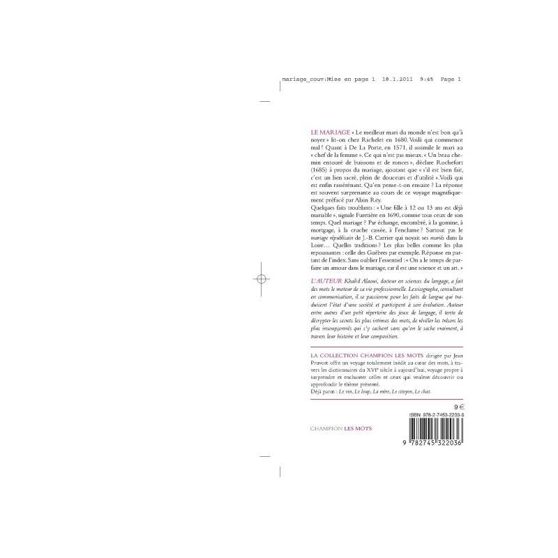 This book offers a profound analysis of the word mariage (marriage). It explains its meaning from the 16th century to today and analyses associated expressions and proverbs as well as meanings of the term that are no longer in use.