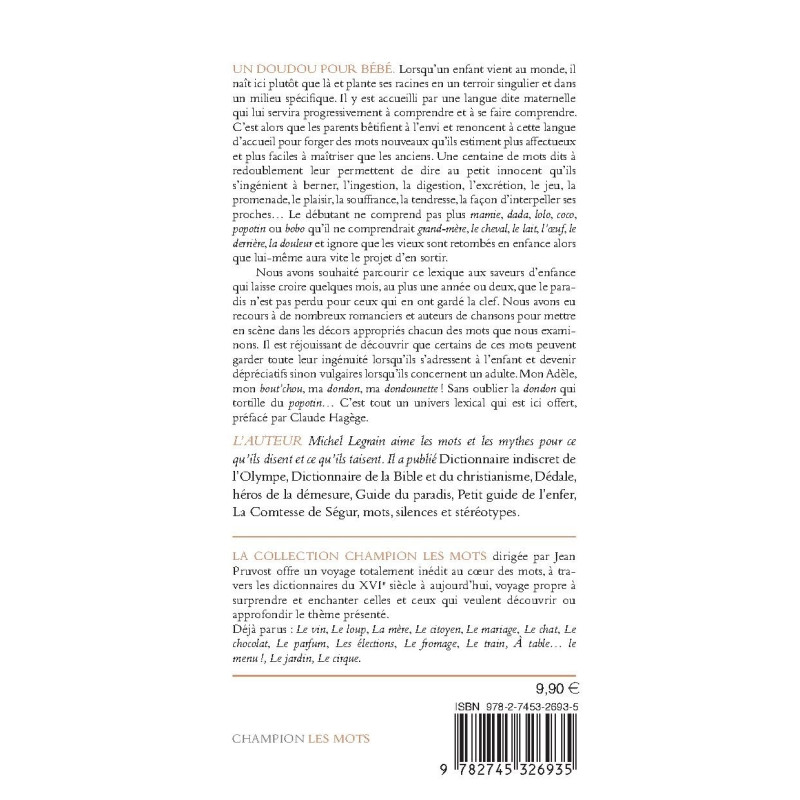 Lorsqu’un enfant vient au monde, il naît ici plutôt que là et plante ses racines en un terroir singulier et dans un milieu spécifique. Il y est accueilli par une langue dite maternelle qui lui servira progressivement à comprendre et à se faire comprendre. C’est alors que les parents bêtifient à l’envi et renoncent à cette langue d’accueil pour forger des mots nouveaux qu’ils estiment plus affectueux et plus faciles à maîtriser que les anciens. Une centaine de mots dits à redoublement leur permettent de dire au petit innocent qu’ils s’ingénient à berner, l’ingestion, la digestion, l’excrétion, le jeu, la promenade, le plaisir, la souffrance, la tendresse, la façon d’interpeller ses proches… Le débutant ne comprend pas plus « mamie », « dada », « lolo », « coco », « popotin » ou « bobo » qu’il ne comprendrait « grand-mère », « le cheval », « le lait », « l’œuf », « le derrière », « la douleur » et ignore que les vieux sont retombés en enfance alors que lui-même aura vite le projet d’en sortir. Nous avons souhaité parcourir ce lexique aux saveurs d’enfance qui laisse croire quelques mois, au plus une année ou deux, que le paradis n’est pas perdu pour ceux qui en ont gardé la clef. Nous avons eu recours à de nombreux romanciers et auteurs de chansons pour mettre en scène dans les décors appropriés chacun des mots que nous examinons. Il est réjouissant de découvrir que certains de ces mots peuvent garder toute leur ingénuité lorsqu’ils s’adressent à l’enfant et devenir dépréciatifs sinon vulgaires lorsqu’ils concernent un adulte. Mon Adèle, mon « bout’chou », ma « dondon », ma « dondounette » ! Sans oublier la « dondon » qui tortille du « popotin »… C’est tout un univers lexical qui est ici offert, préfacé par Claude Hagège.