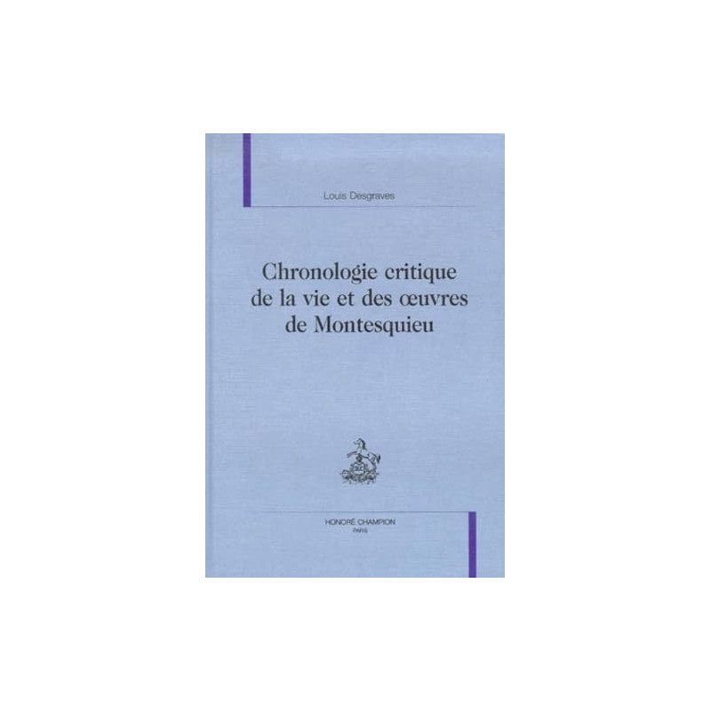 Instrument de travail par excellence, la chronologie critique complète et affine la biographie, sélective par sa nature: elle livre une approche originale de Montesquieu et de son œuvre par le recours aux sources variées dont dispose le chercheur: écrits de Montesquieu, en particulier Pensées, Spicilège, Voyages, Correspondance : documents d’archives, actes officiels du Parlement de Bordeaux, minutes notariales de La Brède et de Bordeaux, pièces de procès; registres de l’Académie française; archives de l’Académie de Bordeaux ; archives du château de La Brède désormais conservées à la Bibliothèque municipale de Bordeaux ; témoignages de ses contemporains, Argenson, Barbier, Bouhier, Lord Chesterfield, Grimm, Helvétius, Hénault, La Beaumelle, Marais, etc.; réception des œuvres de Montesquieu dans la presse de l’époque; informations précises sur la lente constitution du corpus de ses écrits de sa mort à nos jours. Avec ses 4203 entrées, cette Chronologie critique devrait permette de reconstituer avec une grande précision la biographie de Montesquieu, d’en aborder les aspects les plus variés, allant de la lente maturation de ses œuvres et de sa pensée à la gestion de ses propriétés, sans oublier ses multiples déplacements entre le Bordelais et Paris.
