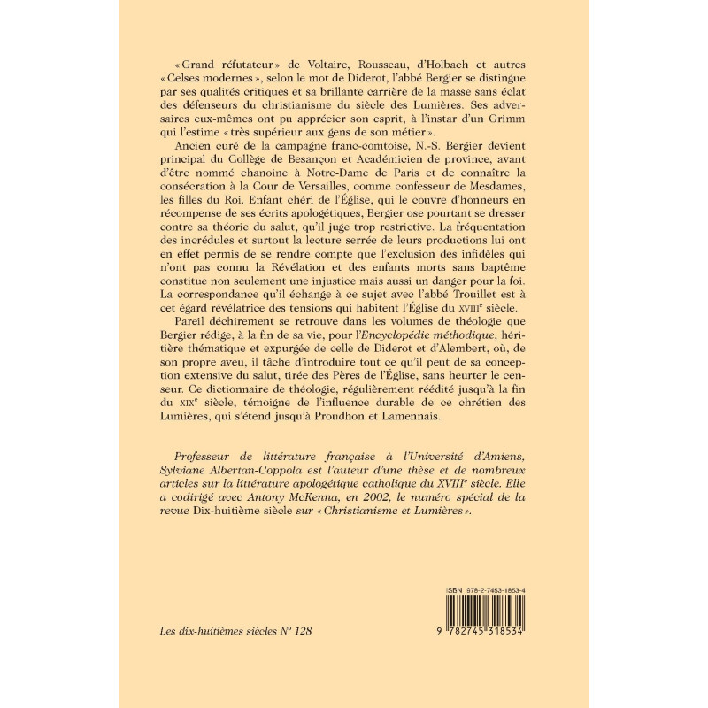 "Grand réfutateur" de Voltaire, Rousseau, d'Holbach et autres "Celses modernes", selon le mot de Diderot, l'abbé Bergier se distingue par ses qualités critiques et sa brillante carrière de la masse sans éclat des défenseurs du christianisme du siècle des Lumières. Ses adversaires eux-mêmes ont pu apprécier son esprit, à l'instar d'un Grimm qui l'estime "très supérieur aux gens de son métier". Ancien curé de la campagne franc-comtoise, N.-S. Bergier devient principal du Collège de Besançon et Académicien de province, avant d'être nommé chanoine à Notre-Dame de Paris et connaître la consécration à la Cour de Versailles, comme confesseur de Mesdames, les filles du Roi. Enfant chéri de l'Église, qui le couvre d'honneurs en récompense de ses écrits apologétiques, Bergier ose pourtant se dresser contre sa théorie du salut, qu'il juge trop restrictive. La fréquentation des incrédules et surtout la lecture serrée de leurs productions lui ont en effet permis de se rendre compte que l'exclusion des infidèles qui n'ont pas connu la Révélation et des enfants morts sans baptême constitue non seulement une injustice mais aussi un danger pour la foi. La correspondance qu'il échange à ce sujet avec l'abbé Trouillet est à cet égard révélatrice des tensions qui habitent l'Église du XVIIIe siècle. Pareil déchirement se retrouve dans les volumes de théologie que Bergier rédige, à la fin de sa vie, pour l'Encyclopédie méthodique, héritière thématique et expurgée de celle de Diderot et d'Alembert, où, de son propre aveu, il tâche d'introduire tout ce qu'il peut de sa conception extensive du salut, tirée des Pères de l'Église, sans heurter le censeur. Ce dictionnaire de théologie, régulièrement réédité jusqu'à la fin du XIXe siècle, témoigne de l'influence durable de ce chrétien des Lumières, qui s'étend jusqu'à Proudhon et Lamennais.