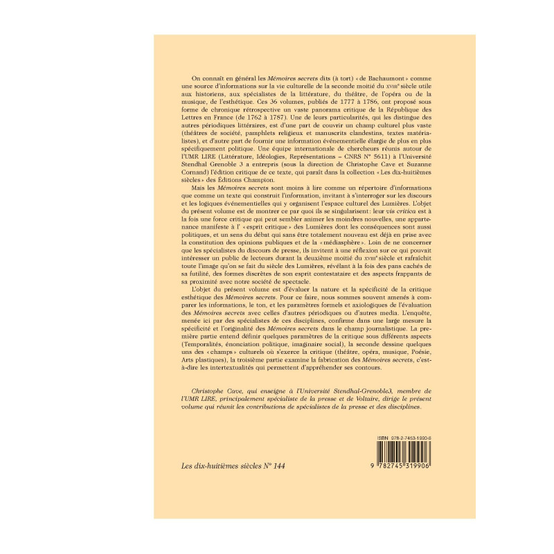 iècle des Lumières, révélant à la fois des pans cachés de sa futilité, des formes discrètes de son esprit contestataire et des aspects frappants de sa proximité avec notre société de spectacle. L'objet du présent volume est d'évaluer la nature et la spécificité de la critique esthétique des Mémoires secrets. Pour ce faire, nous sommes souvent amenés à comparer les informations, le ton, et les paramètres formels et axiologiques de l'évaluation des Mémoires secrets avec celles d'autres périodiques ou d'autres media. L'enquête, menée ici par des spécialistes de ces disciplines, confirme dans une large mesure la spécificité et l'originalité des Mémoires secrets dans le champ journalistique. La première partie entend définir quelques paramètres de la critique sous différents aspects (Temporalités, énonciation politique, imaginaire social), la seconde dessine quelques uns des " champs" culturels où s'exerce la critique (théâtre, opéra, musique, Poésie, Arts plastiques), la troisième partie examine la fabrication des Mémoires secrets, c'està - dire les intertextualités qui permettent d'appréhender ses contours.