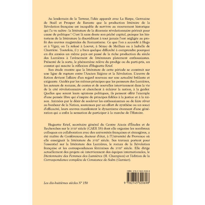 Au lendemain de la Terreur, l'idée apparaît avec La Harpe, Germaine de Staël et Prosper de Barante que la production littéraire de la Révolution française est incapable de survivre au mouvement historique qui l'a vu naître : la littérature de la décennie révolutionnaire périrait pour cause de politique! C'est là sans doute son péché capital, puisque les historiens de la littérature la discréditant à tout jamais l'ont négligée au profit des œuvres magistrales du Romantisme. Ce que l'on a accordé à Hugo et à Vigny, on l'a refusé à Louvet, à Sénac de Meilhan ou à Isabelle de Charrière. Toutefois, il y a bien quelque difficulté à comprendre pourquoi en dix années un même pays est passé de la riche production du siècle des Lumières à l'avènement de littérateurs platement enthousiastes. Présenté de la sorte, le phénomène relève du prodige ou du parti-pris, un constat qui suscite la réflexion d'Huguette Krief. Son étude montre que la littérature de cette période se construit sur une ligne de rupture entre l'Ancien Régime et la Révolution. L'œuvre de fiction devient l'affaire d'un regard nouveau sur une actualité brûlante et exigeante. Guidés par les mêmes principes que les penseurs des Lumières, les auteurs de romans, de contes et de nouvelles interviennent dans la vie de la cité révolutionnaire et cherchent à éclairer la nation, à la guider. Quelles que soient leurs opinions politiques, ils pensent offrir l'exemple d'une pensée libre qui s'inspire de principes fidèles à la justice et à la raison. Animées par le désir de soulever les enthousiasmes ou de faire rêver au bonheur de la Nation, soutenues par un effort de synthèse ou un souci d'efficacité, leurs œuvres manifestent le dynamisme étonnant d'une génération qui a enfin la sensation de participer à la marche de l'Histoire.