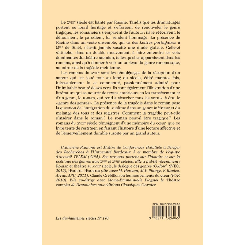 The presence of Racine’s ghost, and of his dominant theatrical voices, can be felt throughout the novels of the 18th century. This reveals the author’s superlative popularity at the time, and the genre’s tendency to absorb earlier texts – which begs the question of whether tragedy is compatible with the novel.