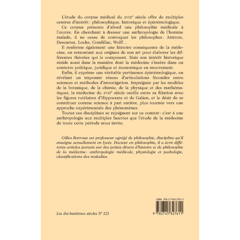 L`étude du corpus médical du XVIIIe siècle offre de multiples centres d`intérêt: philosophique, historique et épistémologique. Ce corpus présente d`abord une philosophie médicale à l`œuvre. En cherchant à dresser une anthropologie de l`homme malade, il ne cesse de convoquer les philosophes: Aristote, Descartes, Locke, Condillac, Wolff… Il renferme également une histoire conséquente de la médecine, en remontant aux origines de son art pour élaborer les différentes théories qui le composent. Mais son intérêt historique réside aussi dans la manière dont la médecine s`insère dans un contexte politique, juridique et économique en mouvement. Enfin, il exprime une véritable pertinence épistémologique, en révélant un imposant réseau d`articulations fécondes entre sciences et méthodes d`investigation. Imprégnée par les modèles de la botanique, de la chimie, de la physique et des mathématiques, la médecine du XVIIIe siècle oscille entre sa filiation avec les figures tutélaires d`Hippocrate et de Galien, et le désir de se constituer comme science à part entière, plus tournée vers une approche expérimentale des phénomènes. Toutes ces disciplines se rejoignent sur ce constat : c`est à une anthropologie aux multiples facettes que l`étude de la médecine de toute cette période nous invite.