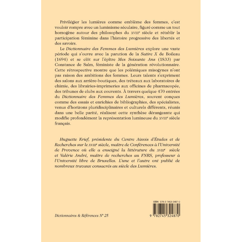 This dictionary of the women of the Enlightenment attempts to do justice to the unsung female influence on the progress of knowledge and freedom. Its 470 entries, written by scholars from a wide array of disciplines, cover a wide period (1694-1833) and profoundly transform the image of the French 18th century.
