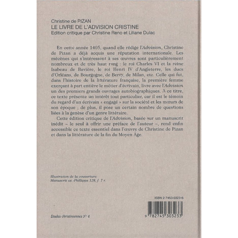 Cette édition critique de l'Advision, basée sur un manuscrit inédit - le seul à offrir une préface de l'auteur -, rend enfin accessible ce texte essentiel dans l'œuvre de Christine de Pizan et dans la littérature de la fin du Moyen Âge.