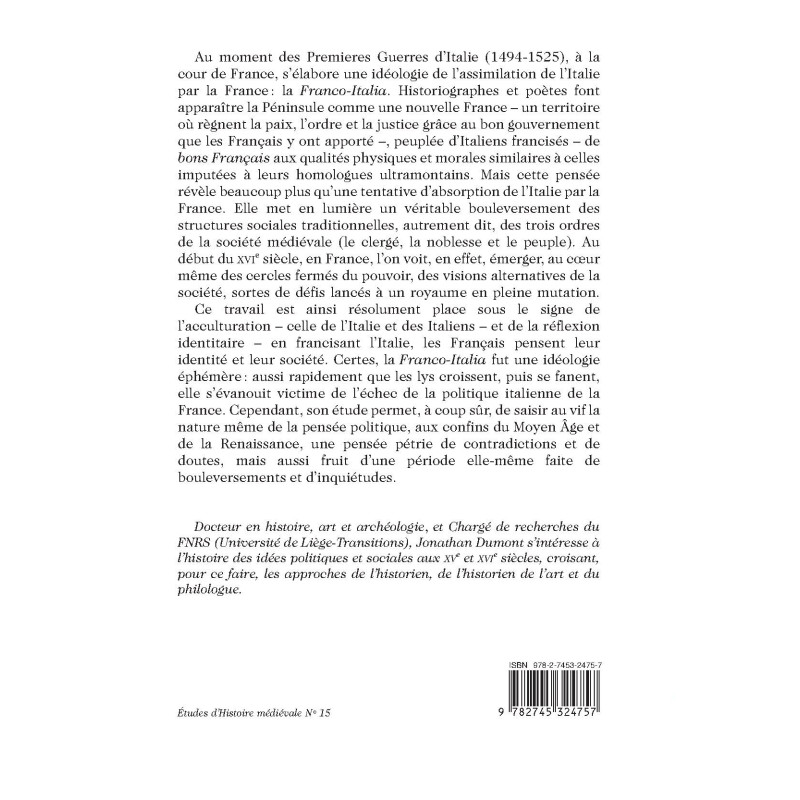The first Italian wars (1494-1525) gave rise within the French court to an ideology that favored Italy’s assimilation. This reveals the social disruption of the kingdom and the political thinking of the early Renaissance, marked as it was by the contradictions and doubts of an era rich in worrying upheavals.