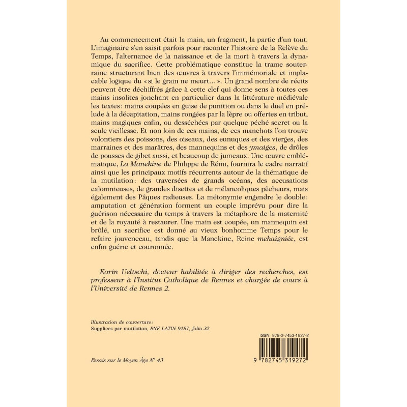 Au commencement était la main, un fragment corporel, la partie d`un tout. L`imaginaire s`en saisit parfois pour raconter l`histoire de la Relève du Temps, l`alternance de la naissance, de la mort et de la résurrection à travers la dynamique du sacrifice. Un grand nombre de récits peuvent être déchiffrés grâce à cette clef qui donne un sens à toutes ces mains qui en particulier au Moyen Âge jalonnent bien des textes. Une œuvre emblématique, La Manekine de Philippe de Rémi fournira le cadre narratif ainsi que les principaux motifs récurrents autour de la mutilation. Une main est coupée, un mannequin est brûlé, un sacrifice est donné au vieux bonhomme Temps pour le refaire jouvenceau, tandis que la Reine blessée est enfin guérie et couronnée. Karin Ueltschi, docteur habilitée à diriger des recherches, est professeur à l`Institut Catholique de Rennes et chargée de cours à l`Université de Rennes 2.