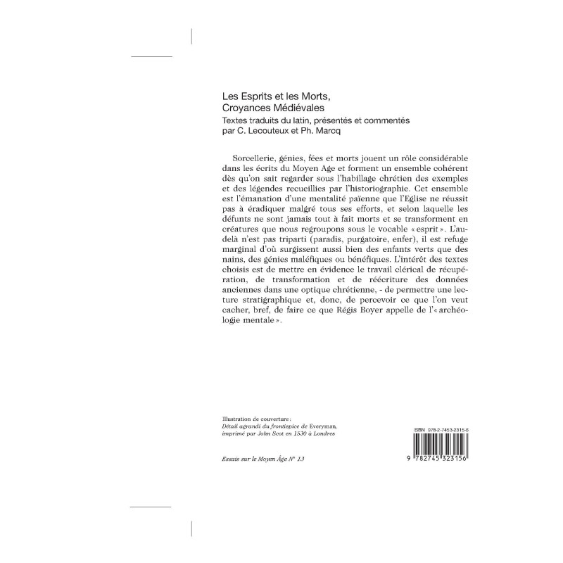 Sorcellerie, génies, fées et morts jouent un rôle considérable dans les écrits du Moyen Age et forment un ensemble cohérent dès qu`on sait regarder sous l`habillage chrétien des exemples et des légendes recueillies par l`historigraphie. Cet ensemble est l`émanation d`une mentalité paîenne que l`Église ne réussit pas à éradiquer malgré tous ses efforts, et selon laquelle les défunts ne sont jamais tout à fait morts et se transforment en créatures que nous regroupons sous le vocable " esprit ". L`au-delà n`est pas triparti (paradis, purgatoire, enfer), il est refuge marginal d`où surgissent aussi bien des enfants verts que des nains, des génies maléfiques ou bénéfiques. L`intérêt des textes choisis est de mettre en évidence le travail clérical de récupération, de transformation et de réécriture des données anciennes dans une optique chrétienne, - de permettre une lecture stratigraphique et, donc, de percevoir ce que l`on veut cacher, bref, de faire ce que Régis Boyer appelle de l` " archéologie mentale ".