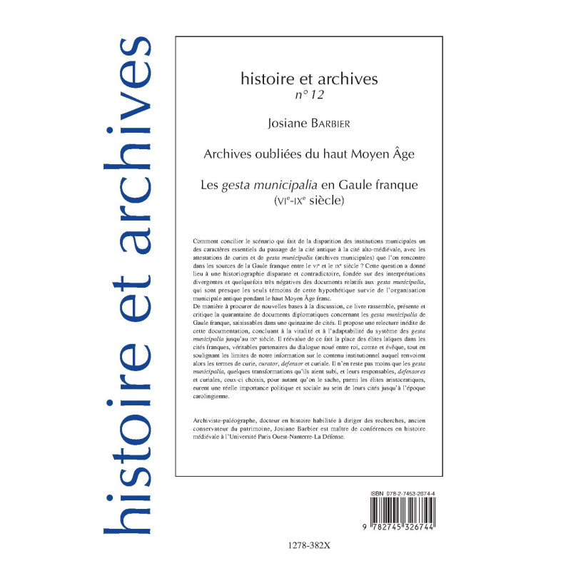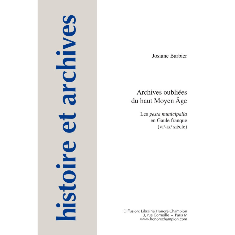 This study offers a rereading of the 40-odd available diplomatic documents about the gesta municipalia (municipal archives) of Frankish Gaul (6thc. - 9thc.). It reevaluates the role of the lay elite and underscores the importance of the gesta municipalia and the people in charge of them until the Carolingian era.