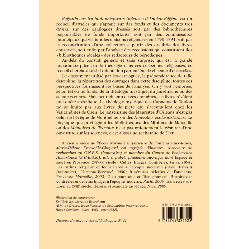 Regards sur les bibliothèques religieuses d’Ancien Régime est un recueil d’articles qui s’appuie sur des fonds et des documents très divers, sur des catalogues dressés soit par des bibliothécaires responsables de fonds importants, soit par des commissaires municipaux qui visitent les maisons religieuses en 1790-1791, soit par la reconstitution d’une collection à partir des ex-libris des livres conservés, soit enfin par l’analyse des recensions qui constituent des « bibliothèques idéales » des rédacteurs de périodiques.
