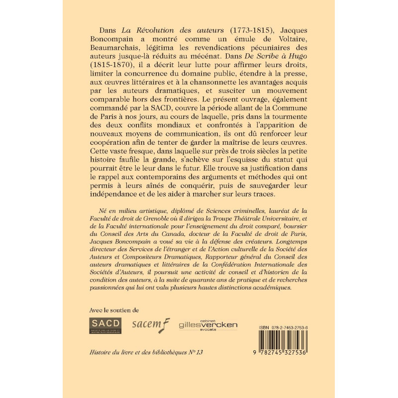 Dans La Révolution des auteurs, (1773-1815), Jacques Boncompain a montré comment, un émule de Voltaire, Beaumarchais, légitima les revendications pécuniaires des auteurs jusque-là réduits au mécénat. Dans De Scribe à Hugo, (1815-1870), il a décrit leur lutte pour affirmer leurs droits, limiter la concurrence du domaine public, étendre à la presse, aux oeuvres littéraires et à la chansonnette les avantages acquis par les auteurs dramatiques, et susciter un mouvement comparable hors des frontières. Le présent ouvrage, également commandé par la SACD, couvre la période allant de la Commune de Paris à nos jours, au cours de laquelle, en étant pris dans la tourmente des deux conflits mondiaux et confrontés à l’apparition de nouveaux moyens de communication, ils ont dû renforcer leur coopération afin de tenter de garder la maîtrise de leurs oeuvres.