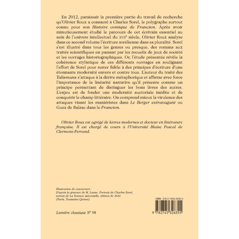 dans ce second volume l’écriture sorélienne dans sa pluralité. Sorel s’est illustré dans tous les genres ou presque, des romans aux traités scientifiques en passant par les recueils de jeux de société et les ouvrages historiographiques. Or, l’étude présentée révèle la cohérence stylistique de ces différents ouvrages en soulignant l’effort de Sorel pour rester fidèle à des principes d’écriture d’une étonnante modernité envers et contre tous. L’auteur du traité des Talismans s’attaque à la dérive métaphorique et affirme avec force l’importance de la linéarité narrative qu’il présente comme un principe permettant de distinguer les bons livres des autres. L’enjeu est de fonder une modernité auctoriale inédite et de conquérir le champ littéraire. On comprend mieux la virulence des attaques visant les maniéristes dans Le Berger extravagant ou Guez de Balzac dans le Francion.