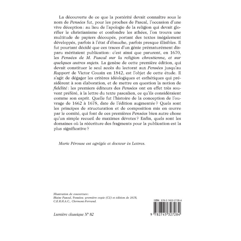 Les Pensées de M. Pascal sur la religion chrestienne, et sur quelques autres sujets, parurent chez Guillaume Desprez en 1670. La genèse de cette première édition, qui devait fournir le seul accès du lectorat aux Pensées jusqu`au Rapport de Victor Cousin en 1842, constitue l`objet de cette étude. En effet, les libertés que le "comité de Port-Royal" prit avec le texte pascalien, afin de convertir en livre les fragments inachevés qui avaient été retrouvés à la mort de leur auteur, sont bien connues, et conduisent souvent à sous-estimer l`intérêt de cet ouvrage passionnant. Il restait à dégager les critères idéologiques et esthétiques qui présidèrent à son élaboration, ce qui implique de réévaluer la notion de fidélité : en préférant, à la lettre du texte pascalien, ce qu`ils considéraient comme son esprit, les premiers éditeurs des Pensées ont obéi à une certaine idée de la littéralité, qui mérite amplement d`être envisagée avec soin.