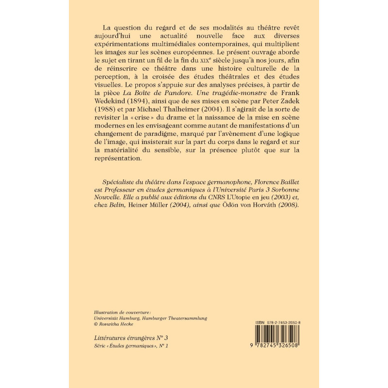 La question du regard et de ses modalités au théâtre revêt aujourd’hui une actualité nouvelle face aux diverses expérimentations multimédiales contemporaines, qui multiplient les images sur les scènes européennes. Le présent ouvrage aborde le sujet en tirant un fil de la fin du XIXe siècle jusqu’à nos jours, afin de réinscrire ce théâtre dans une histoire culturelle de la perception, à la croisée des études théâtrales et des études visuelles. Le propos s’appuie sur des analyses précises, à partir de la pièce « La Boîte de Pandore. Une tragédie-monstre » de Frank Wedekind (1894), ainsi que de ses mises en scène par Peter Zadek (1988) et par Michael Thalheimer (2004). Il s’agirait de la sorte de revisiter la « crise » du drame et la naissance de la mise en scène modernes en les envisageant comme autant de manifestations d’un changement de paradigme, marqué par l’avènement d’une logique de l’image, qui insisterait sur la part du corps dans le regard et sur la matérialité du sensible, sur la présence plutôt que sur la représentation.