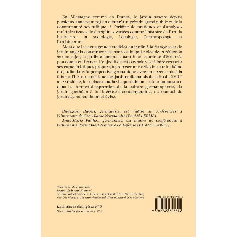 Contrary to its French and English counterparts, the German garden remains little known in France. This study highlights its characteristics by stressing the German garden’s political history (late 18th c. - 21st c.), its place in daily life and its importance vis-à-vis various manifestations of Germanic culture.