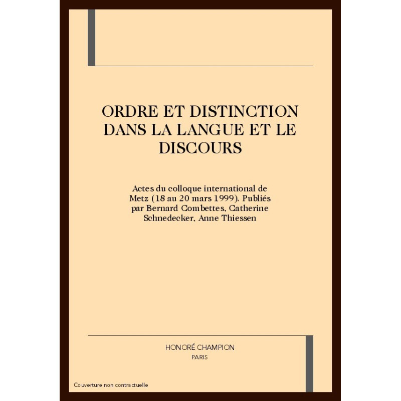 Ordre et distinction dans la langue et le discours concerne des marqueurs linguistiques, encore peu décrits, dont la fonction est de sélectionner et d'extraire un/des objet(s) ou thème(s) de leur discours ambiant pour les distinguer et les porter à l'attention de l'interprète, en les présentant, le cas échéant, suivant un ordre plus ou moins systématisé.