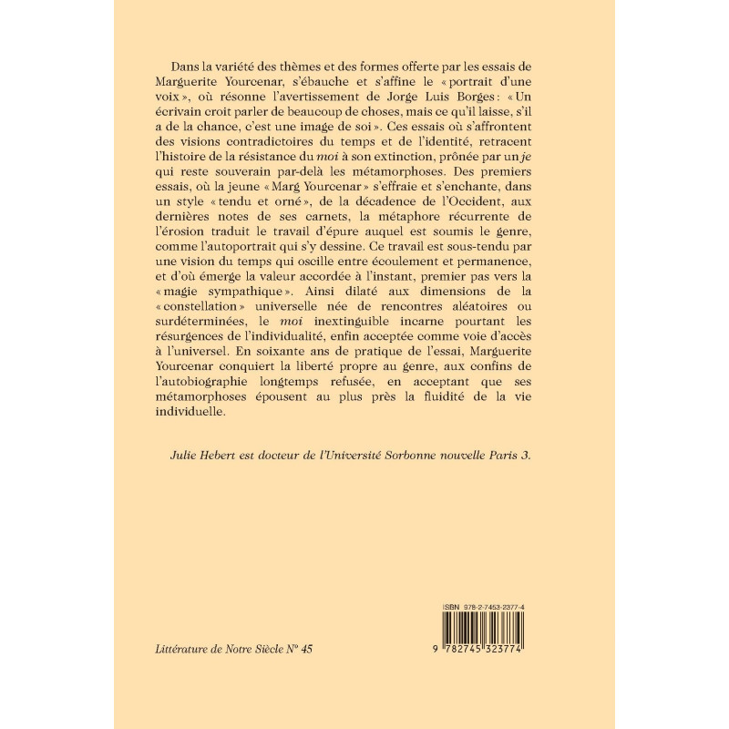 This publication analyses the essays written by Marguerite Yourcenar, a French novelist and essayist of the 20th century