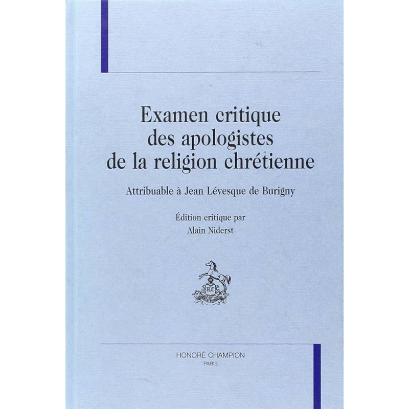 L'Examen critique des apologistes de la religion chrétienne est attribué avec vraisemblance à Jean Lévesque de Burigny ; il aurait été composé dans les années 1730. Il s'agit d'une attaque radicale contre l'autorité de la doctrine chrétienne et des textes scripturaires par un lecteur attentif des apologistes et des historiens chrétiens. Tout l'arsenal érudit de Le Nain de Tillemont est mis à sac pour dénoncer l'arbitraire du canon des textes scripturaires et la tyrannie politique de l'Eglise.