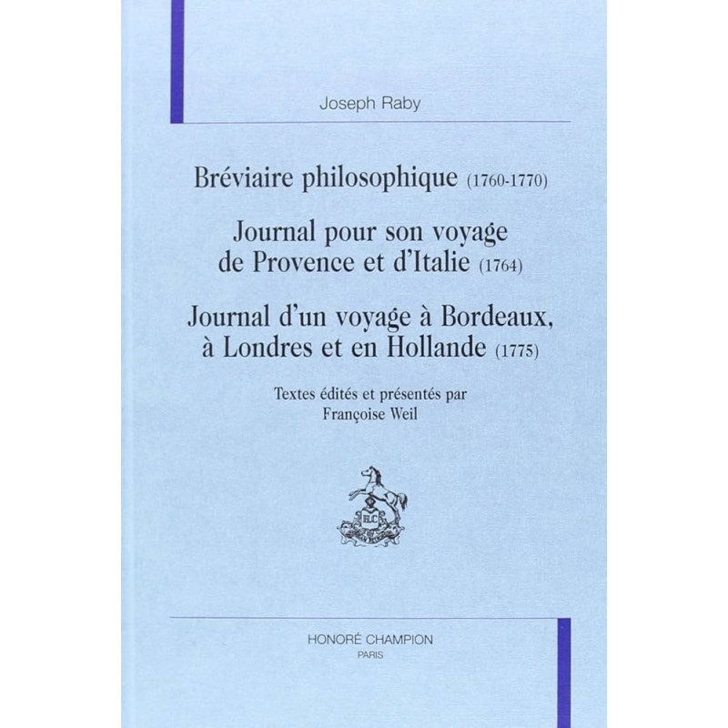 Joseph Raby, dit Raby d'Amérique (1719-1779), fut un des fondateurs de la bibliothèque de Grenoble, à laquelle il légua ses collections. Les manuscrits édités dans ce volume en proviennent. Ses journaux de voyage nous le montrent intéressé par la vie économique des pays qu'il traverse et par les curiosités techniques ; il est curieux aussi de tous les cultes auxquels il peut assister dans les pays protestants. Quant au Bréviaire philosophique, il comprend deux parties : la première, datée de 1770, est intitulée Recherches sur l'origine et la nature de l'âme et sur l'existence de Dieu : les sources en sont quelques articles de l'Encyclopédie et les ouvrages de Clark et de Collins. La seconde partie, intitulée Recherches sur la religion chrétienne, est datée de 1760. Cette deuxième partie comporte une violente dénonciation de l'imposture religieuse, une enquête philosophique sur les thèmes les plus controversés et une réfutation des ouvrages de Ditton et de l'abbé de Houtteville.