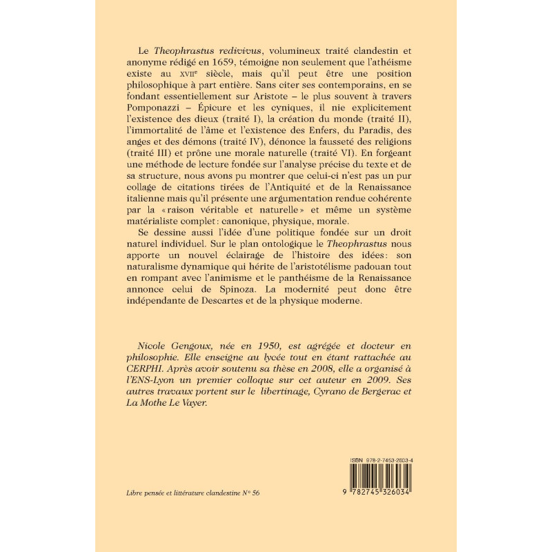 The Theophrastus redivivus (1659), a clandestine and anonymous treatise, shows that atheism existed in the 17th century. It denies the existence of gods (treatise I), the world’s creation (II) and the soul’s immortality (IV). It also denounces religions as fake (III) and promotes a morality based on nature (VI).