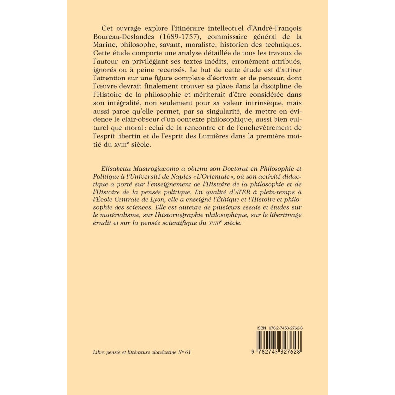 This study explores the intellectual itinerary of André-François Boureau-Deslandes (1689-1757). It encompasses all of his writings, uncovering a complex writer and thinker and highlighting the philosophical context of his era, i.e. the mingling of the libertine spirit with the spirit of the Enlightenment.