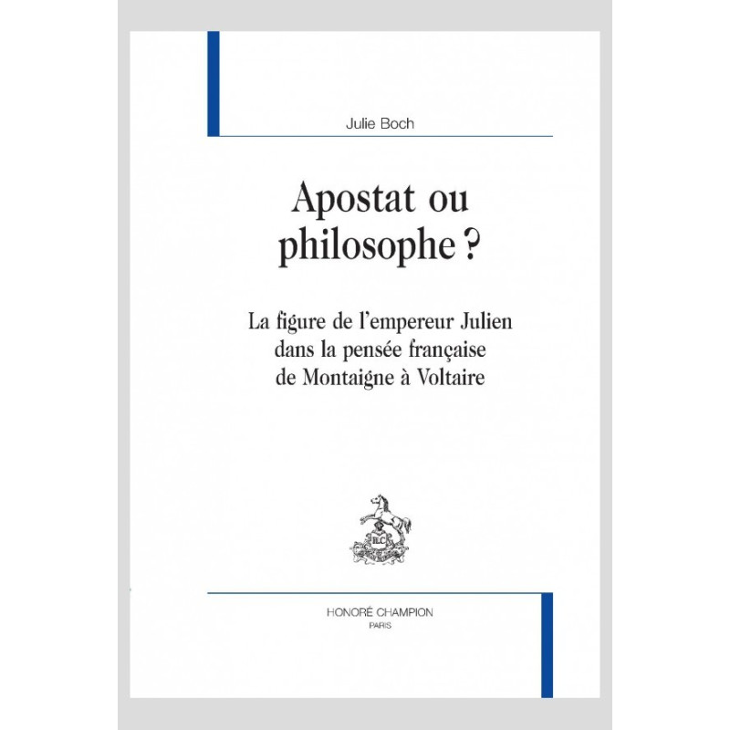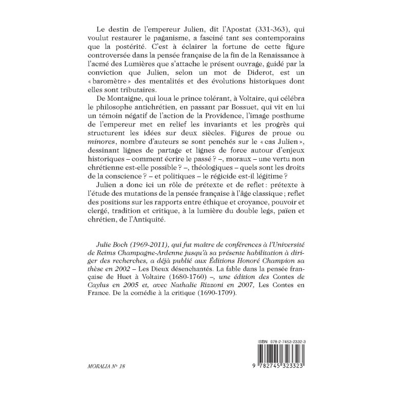 Emperor Julian the Apostate (331-363), who attempted to restore paganism, fascinated both his contemporaries and posterity. He remained controversial among French thinkers from the Renaissance to the Enlightenment and is studied here as a “barometer” of mentalities and of historical shifts.