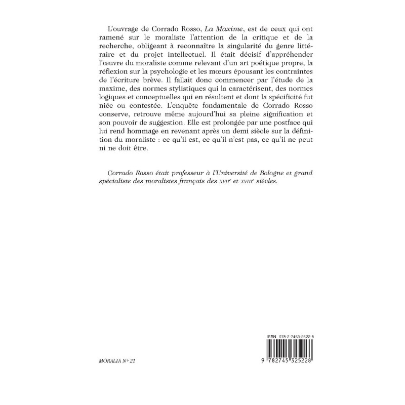Corrado Rosso’s seminal work on maxims established their literary and intellectual singularity, showing how the specific constraints and poetics of the short form mold the moralist’s reflections on psychology and mores. Half a century later, this study remains as meaningful and inspiring as ever.