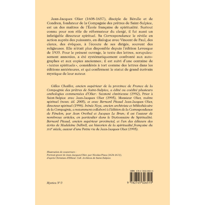Jean-Jacques Olier (1608-1657), founder of the Society of the Priests of Saint-Sulpice, left a voluminous correspondence. This edition (the first published since 1935) provides a carefully reviewed, annotated text. Just under a third of the volume is devoted to spiritual texts hitherto wrongly regarded as letters.