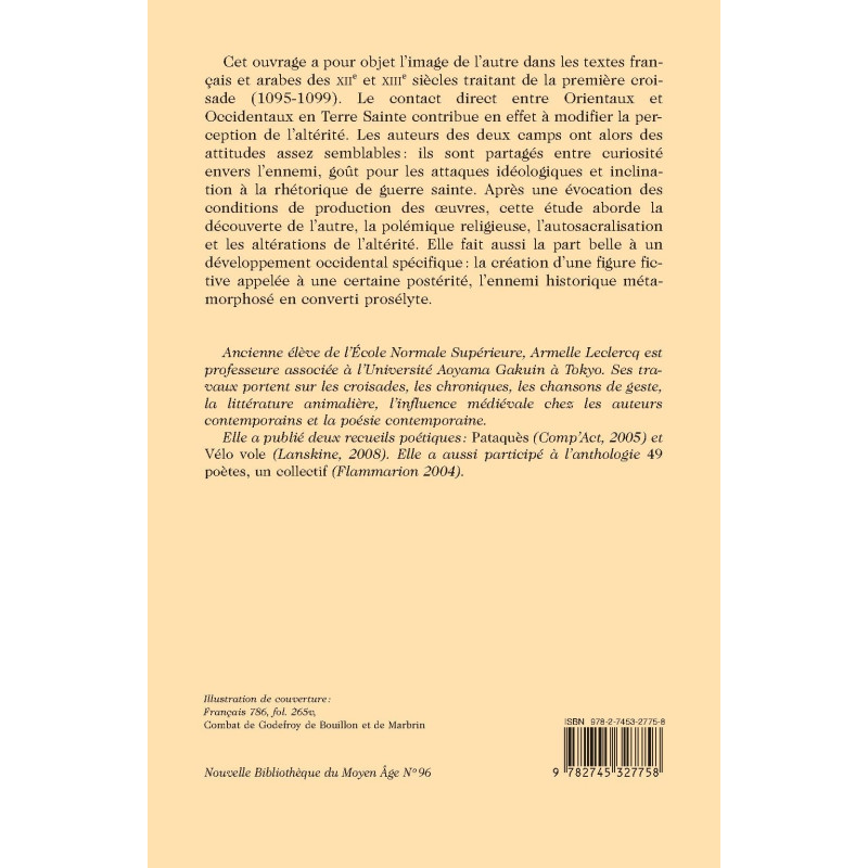 Cet ouvrage a pour objet l’image de l’autre dans les textes français et arabes des XIIe et XIIIe siècles traitant de la première croisade (1095-1099). Le contact direct entre Orientaux et Occidentaux en Terre Sainte contribue en effet à modifier la perception de l’altérité. Les auteurs des deux camps ont alors des attitudes assez semblables : ils sont partagés entre curiosité envers l’ennemi, goût pour les attaques idéologiques et inclination à la rhétorique de guerre sainte. Après une évocation des conditions de production des oeuvres, cette étude aborde la découverte de l’autre, la polémique religieuse, l’autosacralisation et les altérations de l’altérité. Elle fait aussi la part belle à un développement occidental spécifique : la création d’une figure fictive appelée à une certaine postérité, l’ennemi historique métamorphosé en converti prosélyte.