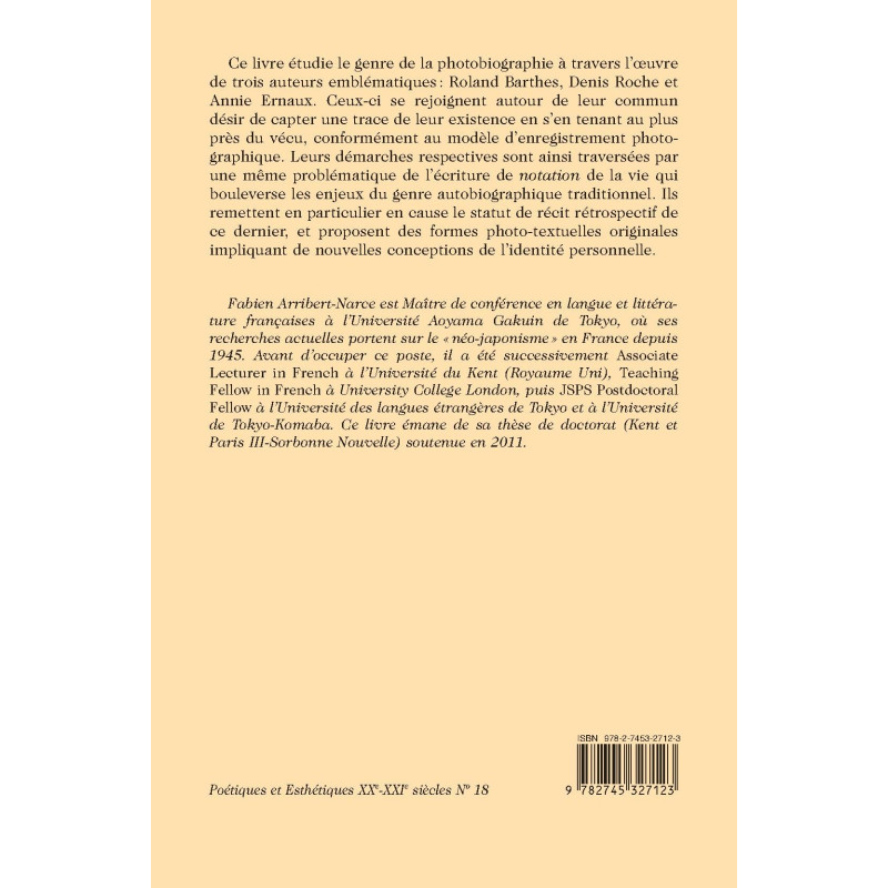 This study of photo-biography as a literary genre focuses on the work of R. Barthes, D. Roche and A. Ernaux. In an attempt to grasp the concrete reality of their lives, these authors follow the model of photography and produce a notational form of “life-writing” that significantly challenges traditional autobiography.