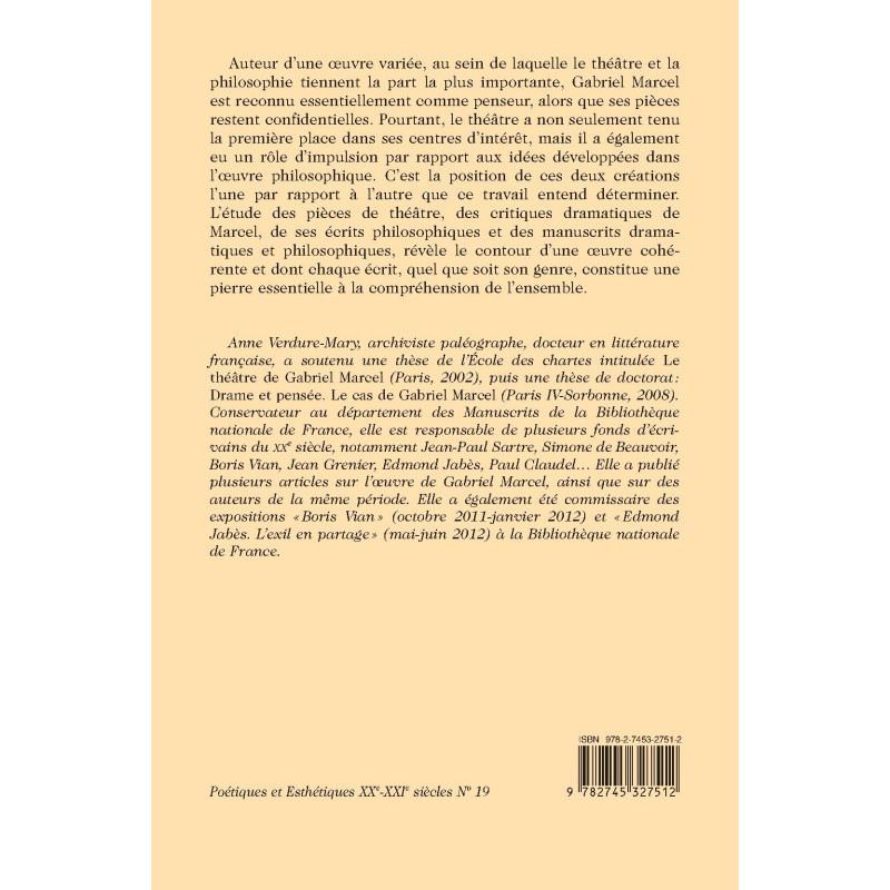 Gabriel Marcel is mainly remembered as a philosopher, although his theater plays were often the catalysts for the ideas he expounded on as a thinker. This study attempts to determine the relative position of both sides of his work, and shows that each text (regardless of genre) is integral to the whole.