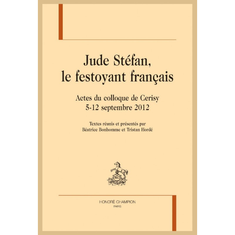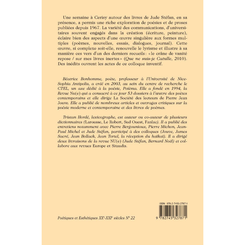This inventive Cerisy conference (5-12 Sept., 2012) explored the prose and poetry published by Jude Stéfan since 1967. These very diverse papers shed light on many aspects of this singular, complex and protean oeuvre (poems, novellas, essays, dialogues, journal), which breathes new life into lyricism.