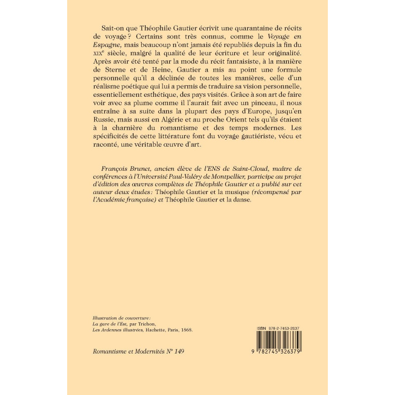 Théophile Gautier wrote around 40 little-known travelogues, taking the reader across Europe and on to Russia, Algeria and the Near East. He developed a personal formula, a poetic realism that enabled him to convey his personal (and essentially aesthetic) vision of the countries he visited.