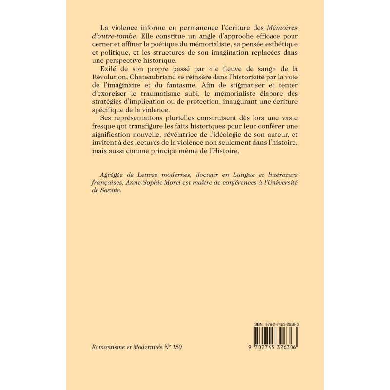 The theme of violence is a revealing entryway into Chateaubriand's poetics, aesthetics and politics, and the constructs of his imagination. Traumatized by the Revolution’s “river of blood”, the memorialist devised strategies of implication or protection, inaugurating a specific way of writing about violence.