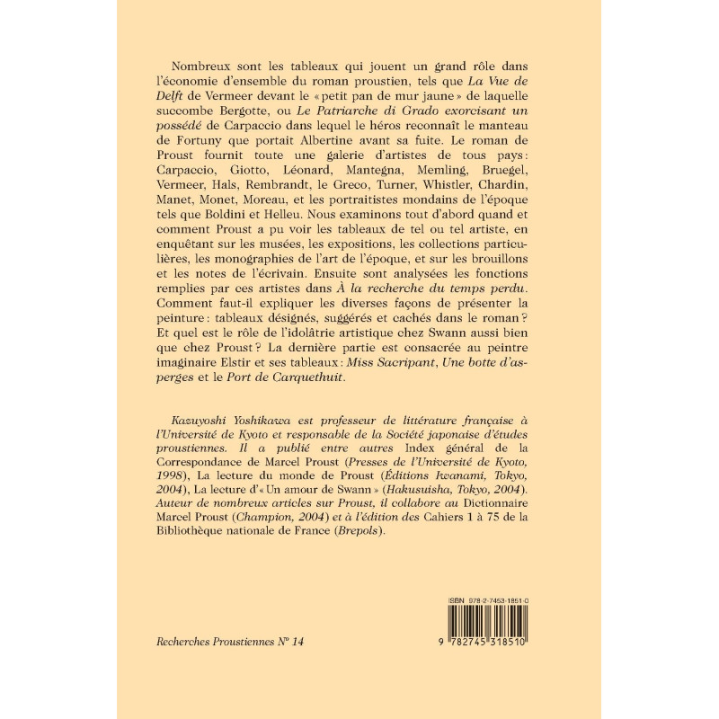 Nombreux sont les tableaux qui jouent un grand rôle dans l'économie d'ensemble du roman proustien, tels que La Vue de Delft de Vermeer devant le " petit pan de mur jaune " de laquelle succombe Bergotte, ou Le Patriarche di Grado exorcisant un possédé de Carpaccio dans lequel le héros reconnaît le manteau de Fortuny que portait Albertine avant sa fuite. Le roman de Proust fournit toute une galerie d'artistes de tous pays : Carpaccio, Giotto, Léonard, Mantegna, Memling, Bruegel, Vermeer, Hals, Rembrandt, le Greco, Turner, Whistler, Chardin, Manet, Monet, Moreau, et les portraitistes mondains de l'époque tels que Boldini et Helleu. Nous examinons tout d'abord quand et comment Proust a pu voir les tableaux de tel ou tel artiste, en enquêtant sur les musées, les expositions, les collections particulières, les monographies de l'art de l'époque, et sur les brouillons et les notes de l'écrivain. Ensuite sont analysées les fonctions remplies par ces artistes dans À la recherche du temps perdu. Comment faut-il expliquer les diverses façons de présenter la peinture : tableaux désignés, suggérés et cachés dans le roman ? Et quel est le rôle de l'idolâtrie artistique chez Swann aussi bien que chez Proust ? La dernière partie est consacrée au peintre imaginaire Elstir et ses tableaux : Miss Sacripant, Une botte d'asperges et le Port de Carquethuit. Kazuyoshi Yoshikawa est professeur de littérature française à l'Université de Kyoto et responsable de la Société japonaise d'études proustiennes. Il a publié entre autres Index général de la Correspondance de Marcel Proust (Presses de l'Université de Kyoto, 1998), La lecture du monde de Proust (Éditions Iwanami, Tokyo, 2004), La lecture d'" Un amour de Swann " (Hakusuisha, Tokyo, 2004). Auteur de nombreux articles sur Proust, il collabore au Dictionnaire Marcel Proust (Champion, 2004) et à l'édition des Cahiers 1à 75 de la Bibliothèque nationale de France (Brepols).
