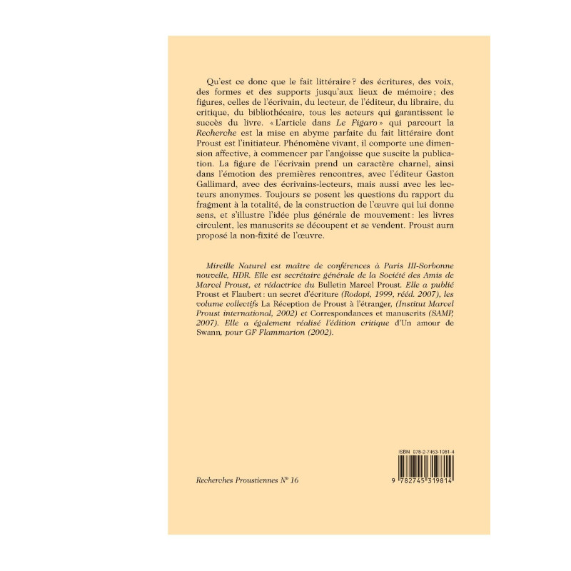 Qu`est ce donc que le fait littéraire? des écritures, des voix, des formes et des supports jusqu`aux lieux de mémoire ; des figures, celles de l`écrivain, du lecteur, de l`éditeur, du libraire, du critique, du bibliothécaire, tous les acteurs qui garantissent le succès du livre. "L`article dans Le Figaro " qui parcourt la Recherche est la mise en abyme parfaite du fait littéraire dont Proust est l`initiateur. Phénomène vivant, il comporte une dimension affective, à commencer par l`angoisse que suscite la publication. La figure de l`écrivain prend un caractère charnel, ainsi dans l`émotion des premières rencontres, avec l`éditeur Gaston Gallimard, avec des écrivains-lecteurs, mais aussi avec les lecteurs anonymes. Toujours se posent les questions du rapport du fragment à la totalité, de la construction de l`œuvre qui lui donne sens, et s`illustre l`idée plus générale de mouvement : les livres circulent, les manuscrits se découpent et se vendent. Proust aura proposé la non-fixité de l`œuvre.